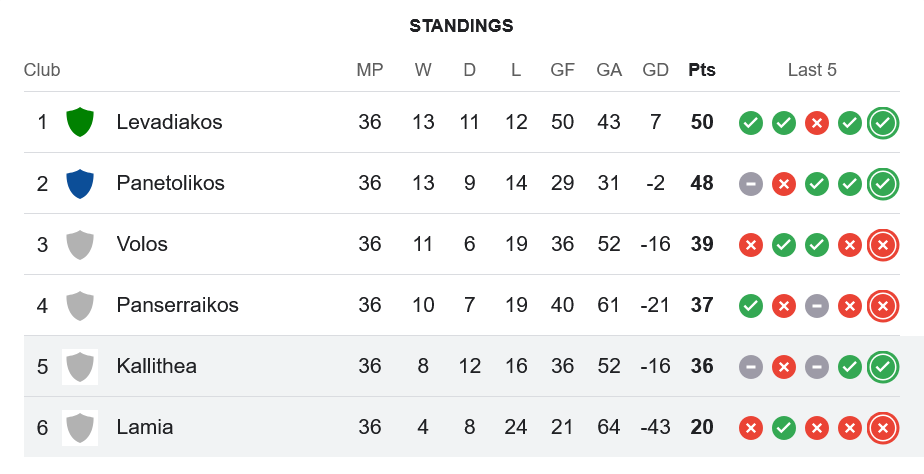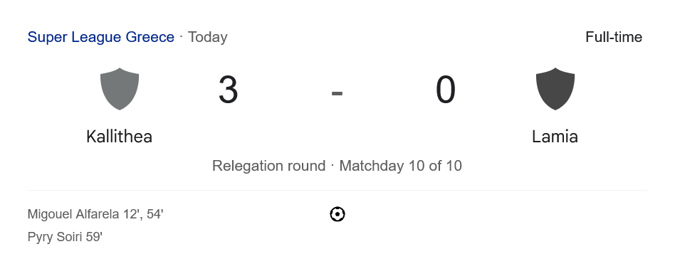 ชัยชนะของคาลิเทียทำให้พวกเขาจบฤดูกาลในอันดับ 5 ของกลุ่มเพลย์ออฟ มี 36 คะแนน จาก 36 นัด รอดตกชั้นอย่างเป็นทางการ ขณะที่ เลเมีย ที่ฟอร์มทรุดอย่างหนักในช่วงท้ายฤดูกาล จบด้วยเพียง 20 คะแนน เป็นอันดับสุดท้ายของตาราง และเตรียมตกชั้นสู่ลีกล่างในฤดูกาลหน้าอย่างเจ็บปวด