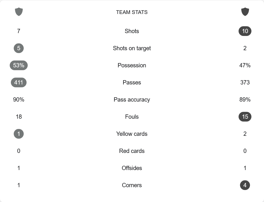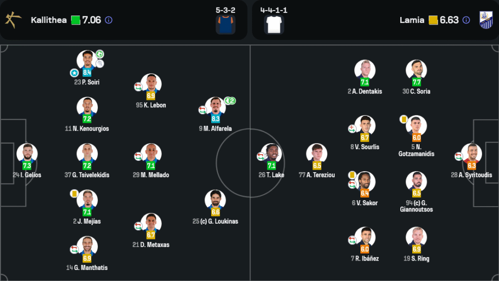 แม้ว่าเลเมียจะเป็นฝ่ายที่ยิงมากกว่า 10 ครั้ง แต่เข้ากรอบเพียง 2 เท่านั้น ขณะที่คาลิเทียยิงเพียง 7 ครั้งแต่เข้ากรอบถึง 5 และเปลี่ยนเป็น 3 ประตูสำคัญ การครองบอลใกล้เคียงกัน (คาลิเทีย 53%, เลเมีย 47%) แต่ความแม่นยำของคาลิเทียในการจ่ายบอลสูงถึง 90% เทียบกับ 89% ของทีมเยือน การฟาวล์เยอะพอกัน (คาลิเทีย 18, เลเมีย 15) แต่ความเด็ดขาดหน้าปากประตูคือสิ่งที่ตัดสินเกมนี้