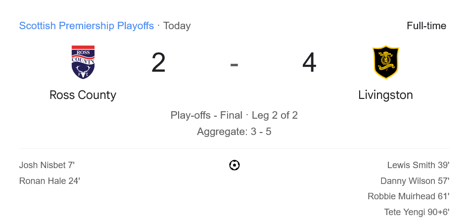 จากชัยชนะในรอบเพลย์ออฟนี้ ลิฟวิงสตัน กลายเป็นทีมที่คว้าตั๋วเลื่อนชั้นสู่ สกอตติช พรีเมียร์ชิพ ได้สำเร็จ พร้อมปิดฉากฤดูกาลอันยอดเยี่ยมแบบเต็มภาคภูมิ ด้าน รอสส์ เคาน์ตี้ ต้องกลับไปเริ่มต้นใหม่ในแชมเปี้ยนชิพฤดูกาลหน้า ถือเป็นความผิดหวังที่ต้องเร่งฟื้นสภาพทีมโดยเร็ว