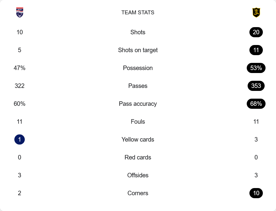 ลิฟวิงสตันเหนือกว่าชัดเจนในหลายด้าน พวกเขาครองบอล 53% ยิงรวม 20 ครั้ง เข้ากรอบถึง 11 ครั้ง ขณะที่รอสส์ เคาน์ตี้มีโอกาสยิงเพียง 10 ครั้ง เข้ากรอบ 5 ครั้ง ลิฟวิงสตันจ่ายบอลแม่นยำ 68% จาก 353 ครั้ง เทียบกับเจ้าบ้านที่ทำได้ 60% จาก 322 ครั้ง ทั้งสองทีมมีจำนวนฟาวล์เท่ากันที่ 11 ครั้ง แต่ลิฟวิงสตันโดนใบเหลืองมากกว่าที่ 3 ใบ ขณะที่ลูกเตะมุม ลิฟวิงสตันได้มากถึง 10 ครั้งเทียบกับรอสส์ เคาน์ตี้แค่ 2 ครั้ง