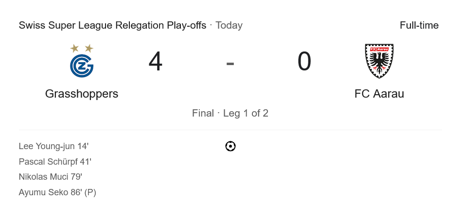 การแข่งขันฟุตบอล สวิสซูเปอร์ลีก เพลย์ออฟตกชั้น เลกแรก ระหว่าง กราสส์ฮ็อปเปอร์ เปิดสนาม Letzigrund Stadium รับการมาเยือนของ อาเรา กลายเป็นเกมที่ทีมเจ้าถิ่นโชว์ฟอร์มดุดัน ไล่ถล่มผู้มาเยือนไปแบบขาดลอย 4-0 สร้างความได้เปรียบอย่างมหาศาลก่อนบุกไปเยือนในนัดที่สอง ซึ่งแน่นอนว่าแฟนบอลที่ติดตาม ผลบอลสด อยู่ต่างได้เห็นความเหนือชั้นของเจ้าถิ่นแบบไม่มีข้อกังขา