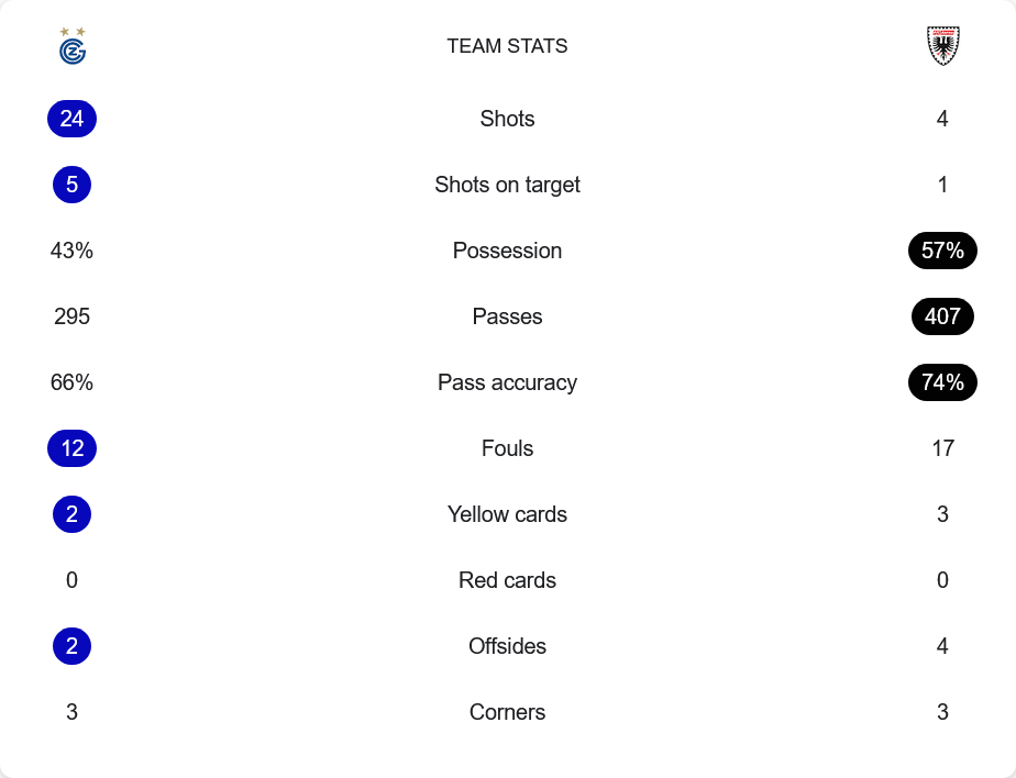 แม้กราสส์ฮ็อปเปอร์จะครองบอลน้อยกว่า (43%) และผ่านบอลเพียง 295 ครั้ง แต่พวกเขาสร้างโอกาสยิงมากถึง 24 ครั้ง และเข้ากรอบ 5 ครั้ง ซึ่งเปลี่ยนเป็น 4 ประตูได้อย่างแม่นยำ ต่างจากอาเราที่แม้จะครองเกมในเชิงสถิติแต่กลับยิงได้เพียง 4 ครั้ง และเข้ากรอบแค่ครั้งเดียว ความแม่นยำในการจ่ายบอลของอาเราก็เหนือกว่าเล็กน้อยที่ 74% ต่อ 66% แต่ไม่มีความหมายเมื่อเปรียบกับความเฉียบคมในการเข้าทำของเจ้าบ้าน เกมนี้ยังมีใบเหลืองรวม 5 ใบ และจังหวะฟาวล์รวมกันถึง 29 ครั้ง บ่งบอกว่าเป็นเกมที่สู้กันหนัก