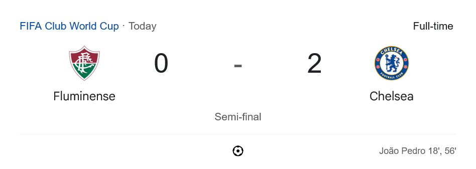 ชัยชนะนัดนี้ส่งเชลซีเข้าสู่รอบชิงชนะเลิศฟีฟ่า คลับเวิลด์คัพทันที โดยพวกเขาผ่านเบนฟิก้า, พัลไมรัส และล่าสุดฟลูมิเนนเซ่ด้วยผลงานสุดเฉียบ ส่วนฟลูมิเนนเซ่จะไปชิงอันดับ 3 หลังจากพ่ายในรอบนี้