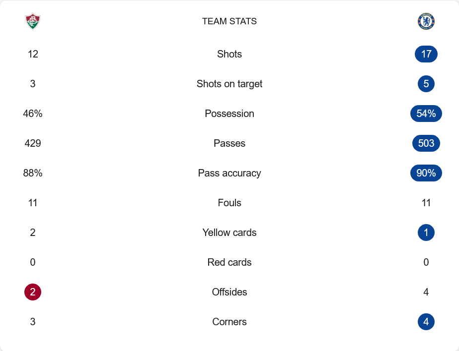 สถิติหลังเกมชี้ว่าเชลซีเหนือกว่าในหลายด้าน โดยครองบอล 54% ต่อ 46% ของฟลูมิเนนเซ่ เชลซีผ่านบอลแม่นกว่า (90% ต่อ 88%) และยิงมากกว่า (17 ต่อ 12) ฟลูมิเนนเซ่เน้นเข้าปะทะหนัก แต่เชลซีคุมเกมได้แน่นกว่า ทั้งคู่ทำฟาวล์เท่ากันที่ 11 ครั้ง แต่ฟลูมิเนนเซ่โดนเหลืองมากกว่าเล็กน้อย