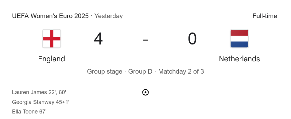 ศึกฟุตบอลหญิงชิงแชมป์แห่งชาติยุโรป 2025 รอบแบ่งกลุ่ม กลุ่ม D เมื่อคืนนี้ บ้านผลบอล รายงาน ผลบอลสด คู่ระหว่างทีมชาติอังกฤษหญิง ปะทะ ทีมชาติเนเธอร์แลนด์หญิง ที่สนามกลางในบรรยากาศสุดมันส์ ปรากฏว่า “สิงโตสาว” อังกฤษ ไล่ถล่มแบบไร้ปราณีด้วยสกอร์ขาดลอย 4-0 เก็บสามแต้มสำคัญคืนความมั่นใจเต็มเปี่ยม