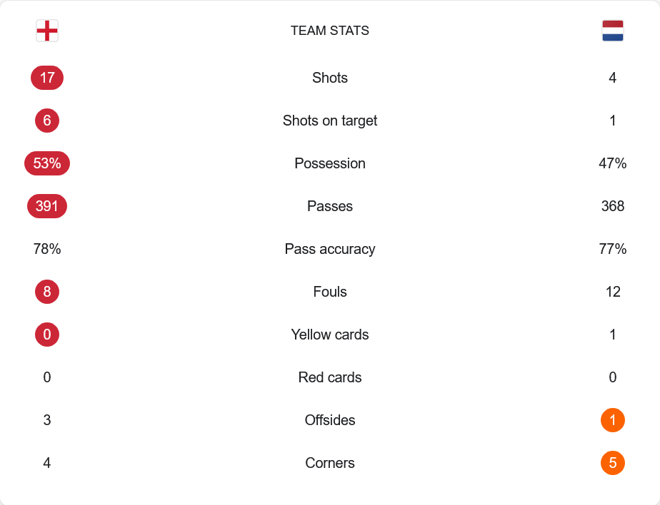 อังกฤษครองบอลเหนือกว่าเล็กน้อยที่ 53% ต่อ 47% ยิงรวม 17 ครั้ง เข้ากรอบ 6 ส่วนเนเธอร์แลนด์มีโอกาสเพียง 4 ครั้งและเข้ากรอบแค่ลูกเดียว การจ่ายบอลของอังกฤษแม่นยำกว่าเล็กน้อย 78% ต่อ 77% อังกฤษฟาวล์ 8 ครั้ง ส่วนเนเธอร์แลนด์ถึง 12 ครั้ง แสดงให้เห็นว่าด้วยความดุดันอังกฤษคุมจังหวะได้หมด