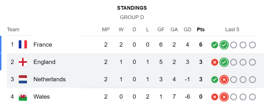 ชัยชนะนัดนี้ส่งอังกฤษขึ้นมามี 3 คะแนนเท่ากับเนเธอร์แลนด์ แต่ลูกได้เสียของอังกฤษดีกว่า ทำให้รั้งอันดับ 2 ของกลุ่ม D ขณะที่ฝรั่งเศสนำเป็นจ่าฝูงมี 6 แต้มเต็มจาก 2 นัด ยังต้องลุ้นต่อในเกมสุดท้ายเพื่อตั๋วเข้ารอบ