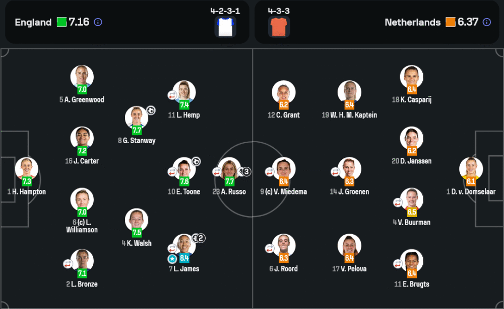 Lauren James คือดาวเด่นของเกมนี้อย่างไร้ข้อกังขา เธอสร้างความแตกต่างด้วยความเร็ว ความคม และความนิ่งในพื้นที่สุดท้าย ยิงคนเดียวสองประตูพร้อมเรตติ้งสูงสุดในสนาม 8.4