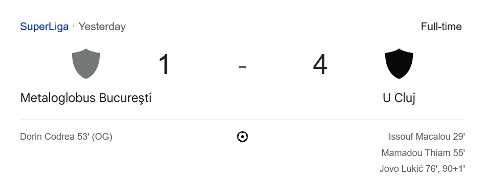 บ้านผลบอล สรุปหลังเกม ยู คลูจ์ ฟอร์มโหด! บุกอัด เมต้าล๊อกโลบูส 4-1 เปิดหัวโรมาเนีย ลีกา1 สุดเดือด