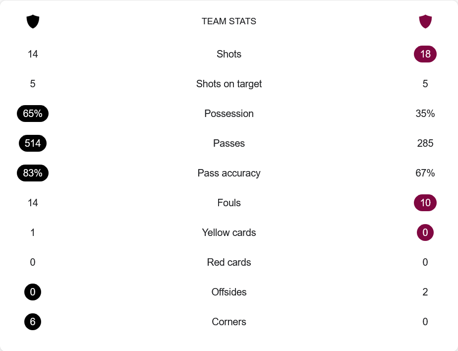 แม้โบฮีเมี่ยนส์จะยิงน้อยกว่ากัลเวย์เล็กน้อย (14 ต่อ 18) แต่พวกเขาครองบอลมากถึง 65% ส่งบอลแม่นยำ 83% มีจังหวะเข้ากรอบ 5 ครั้งและเปลี่ยนเป็น 3 ประตู ส่วนกัลเวย์ครองบอลเพียง 35% และความแม่นยำในการผ่านบอลต่ำกว่า ขณะที่ลูกเตะมุม โบฮีเมี่ยนส์กดไป 6 ครั้งต่อ 0 ของทีมเยือน