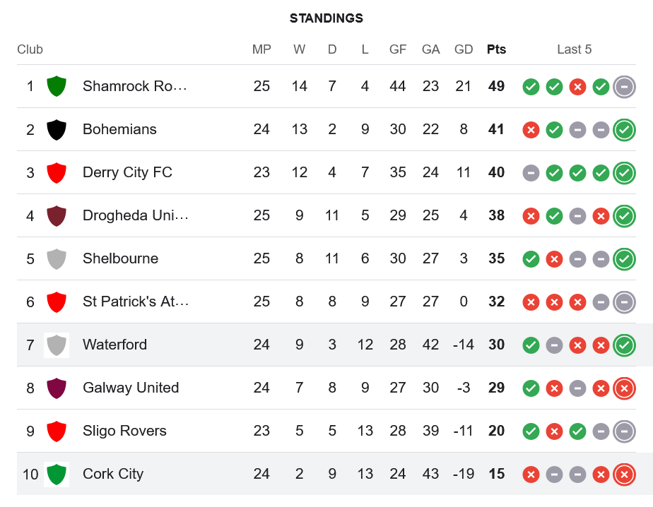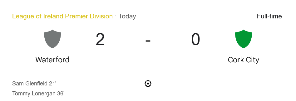 ชัยชนะนัดนี้ทำให้วอเตอร์ฟอร์ดขยับขึ้นอันดับ 7 มี 30 คะแนน ลดช่องว่างกับอันดับ 6 อย่างเซนต์ แพทริคส์ฯ เหลือแค่แต้มเดียว ขณะที่คอร์กยังจมบ๊วย มีแค่ 15 แต้มจาก 24 นัด และต้องเร่งฟอร์มในเกมต่อไปหากไม่อยากตกชั้น
