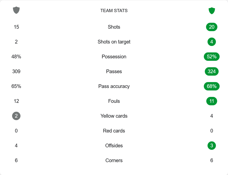 วอเตอร์ฟอร์ดครองบอล 52% ยิงทั้งหมด 20 ครั้ง เข้ากรอบ 4 ครั้ง ขณะที่คอร์กได้ครองบอล 48% ยิงไป 15 ครั้งแต่เข้ากรอบแค่ 2 ครั้ง ความแม่นยำในการจ่ายบอลของวอเตอร์ฟอร์ดอยู่ที่ 68% เทียบกับคอร์ก 65% ฟาวล์รวมทั้งสองทีมเยอะพอสมควรโดยเจ้าบ้านทำไป 11 ครั้งและคอร์ก 12 ครั้ง