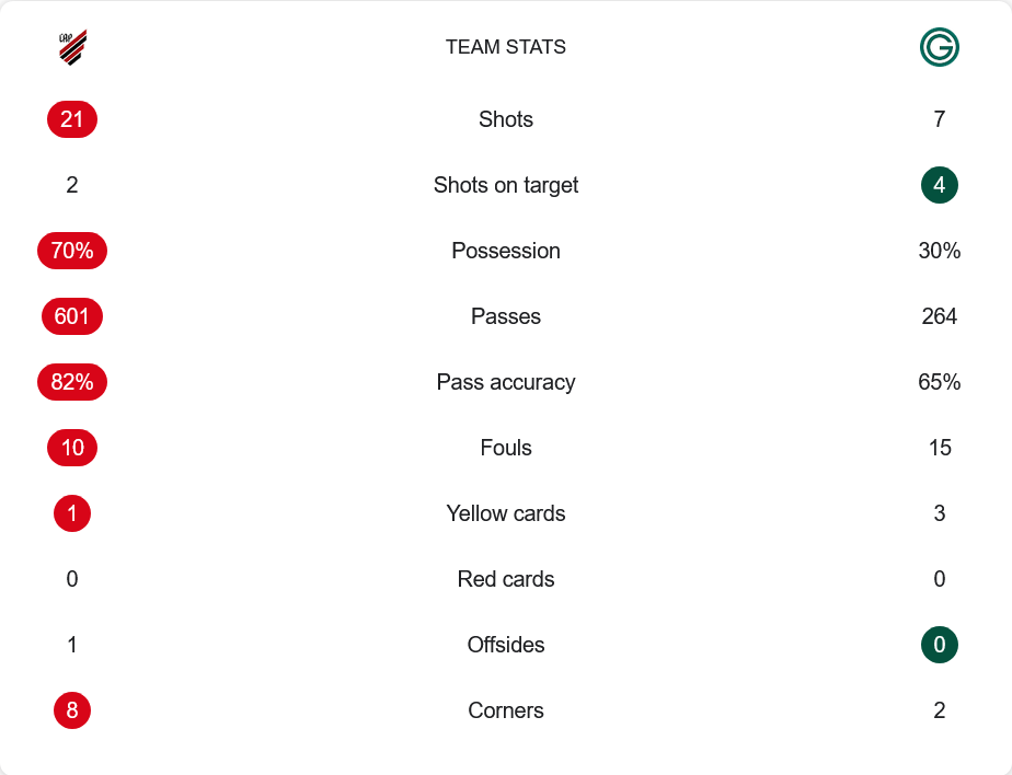 ตลอดเกม แอตเลติโก้ พาราเนนเซ่ครองบอลมากถึง 70% สร้างโอกาสยิงได้ 21 ครั้ง แต่เข้ากรอบแค่ 2 ขณะที่โกยาสยิงน้อยกว่าแค่ 7 ครั้งแต่ตรงกรอบถึง 4 และเปลี่ยนเป็นประตูได้สำเร็จ เจ้าถิ่นผ่านบอลแม่นกว่า 82% ต่อ 65% ของทีมเยือน แต่โกยาสเล่นเกมรับได้อย่างมีวินัย ทำฟาวล์ 15 ครั้งเพื่อหยุดเกมรุกเจ้าบ้านอย่างได้ผล