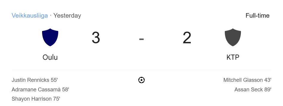 ตัวสำรองสำคัญ: มูซา จัตต้า (24’), จูเลียส พานาเนน (62’), อิโร เมนโดลิน (74’), ชายอน แฮร์ริสัน (74’)