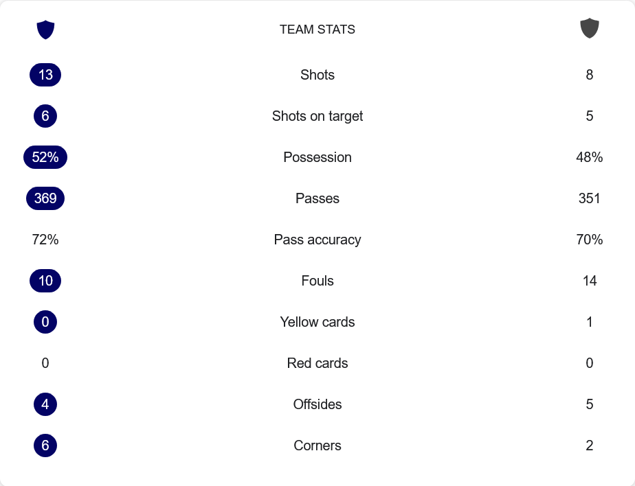 โอลูมีเปอร์เซ็นต์ครองบอล 52% และสร้างโอกาสยิงทั้งหมด 13 ครั้ง เข้ากรอบ 6 ครั้ง ขณะที่เคทีพีแม้จะครองบอลเพียง 48% แต่ก็มีโอกาสยิงถึง 8 ครั้งและเข้ากรอบ 5 ครั้ง ทั้งสองทีมเล่นกันอย่างสูสีทั้งจำนวนจ่ายบอลและความแม่นยำ แต่โอลูได้เปรียบเล็กน้อยในจังหวะสุดท้าย