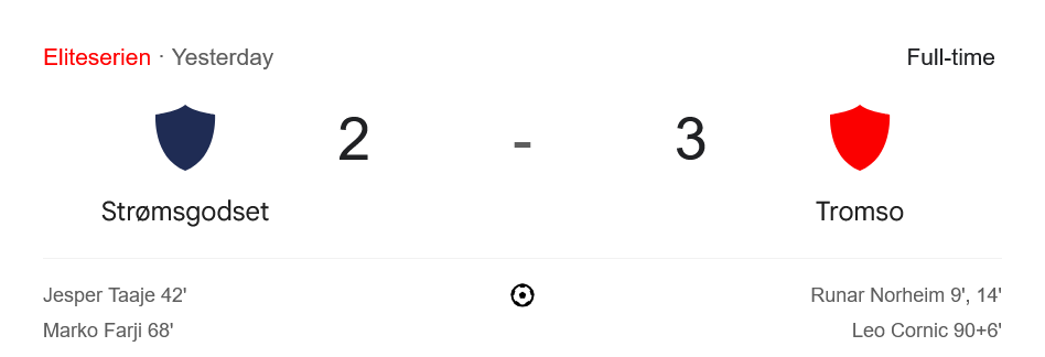 ครึ่งหลังเจ้าบ้านเดินหน้าบุกหนักจนมาตีเสมอ 2-2 จากจังหวะยิงของ มาร์โก ฟาร์ยี นาที 68 เกมทำท่าจะจบด้วยการแบ่งแต้ม แต่ในช่วงทดเจ็บนาที 90+6 ทรอมโซ่ก็มาได้ประตูชัยจาก ลีโอ คอร์นิค ส่งให้ทีมเยือนคว้าชัยไปแบบดราม่าสุดๆ ด้วยสกอร์ 3-2