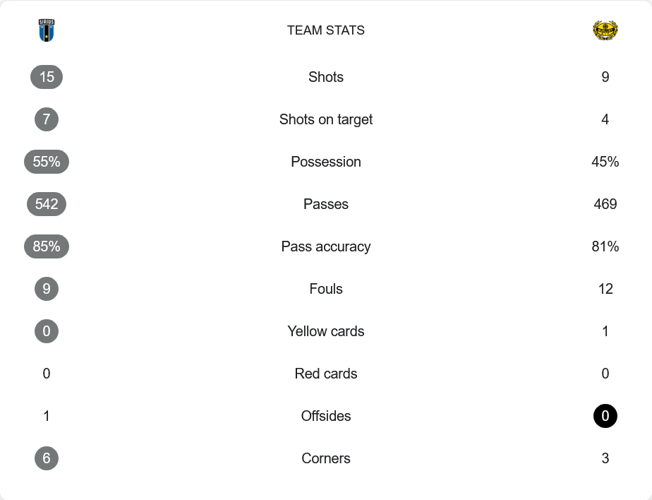 แม้ซิริอุสจะครองบอลมากกว่า 55% และจ่ายบอลแม่นยำถึง 85% แต่กลับยิงเข้ากรอบเพียง 7 ครั้งจาก 15 โอกาส ส่วนมอลล์บี้ครองบอลแค่ 45% แต่ยิงเข้ากรอบ 4 ครั้งและได้ประตูถึง 2 ประตู แสดงให้เห็นถึงประสิทธิภาพการจบสกอร์ของทีมเยือน ทั้งสองทีมเล่นกันหนักหน่วงจนมีฟาวล์รวมกันกว่า 21 ครั้ง