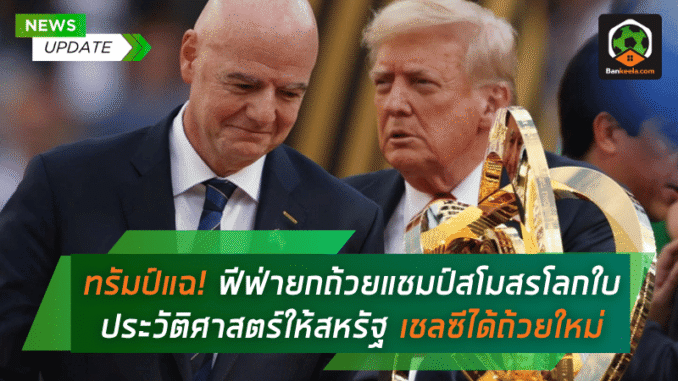 วงการลูกหนังสะเทือนเมื่อ โดนัลด์ ทรัมป์ อดีตประธานาธิบดีสหรัฐอเมริกา ออกมาเปิดเผยแบบไม่มีกั๊กว่า ถ้วยแชมป์สโมสรโลก 2025 ที่สโมสร เชลซี ได้ชูฉลองกันอย่างยิ่งใหญ่หลังเกมนัดชิงฯ นั้น แท้จริงแล้วเป็นเพียงถ้วยที่ทำขึ้นใหม่ เพราะถ้วยต้นฉบับใบแรกของจริงถูก ฟีฟ่า มอบให้เขาเก็บไว้ประดับในห้องทำงานรูปไข่ที่ทำเนียบขาวไปเรียบร้อยแล้ว!