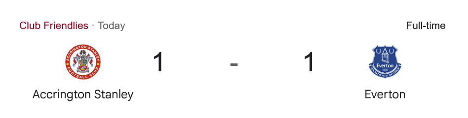 จาก : ผลบอลสด กระชับมิตรสโมสร ระหว่าง แอคคริงตัน สแตนลี่ย์ 1-1 เอฟเวอร์ตัน วันนี้ 16/7/68 – บ้านกีฬา