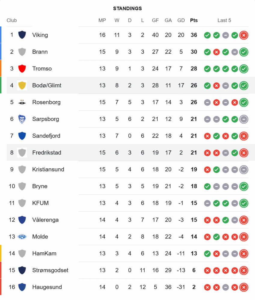 ชัยชนะนัดนี้ทำให้โบโด กลิมท์เก็บเพิ่มเป็น 26 คะแนน ขยับรั้งอันดับ 4 ตามหลังจ่าฝูงไวกิ้งอยู่ 10 คะแนนแต่แข่งน้อยกว่า 3 นัด ด้านเฟรดริกซ์สตรัดยังหยุดอยู่ที่ 21 คะแนน รั้งอันดับ 8 ของตาราง