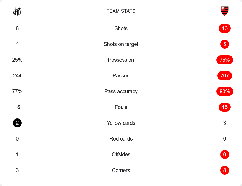 แม้ฟลาเมงโกจะครองบอลถึง 75% และมีจังหวะยิงมากกว่า 10 ครั้ง แต่ซานโตสกลับเฉียบขาดกว่าในจังหวะสำคัญ ขณะที่ซานโตสได้ครองบอลเพียง 25% ยิงไป 8 ครั้งแต่เป้าหมาย 4 ครั้ง เกมนี้เต็มไปด้วยการปะทะ ฟาวล์รวมถึง 31 ครั้ง และใบเหลือง 5 ใบ
