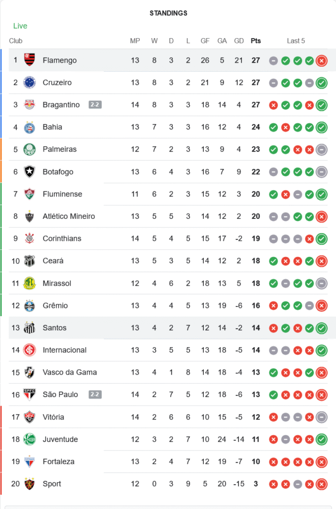ชัยชนะในเกมนี้ทำให้ซานโตสขยับขึ้นมาอยู่ที่อันดับ 13 ของตาราง มี 14 คะแนน เท่ากับอินเตอร์นาซิอองนาล แต่ผลต่างประตูได้เสียยังเป็นรอง ส่วนฟลาเมงโกแม้จะแพ้แต่ยังคงรั้งจ่าฝูงร่วมกับครูไซโร่และบรากันติโน่ด้วย 27 คะแนน แต่เริ่มรู้สึกถึงแรงกดดันจากทีมตามหลัง