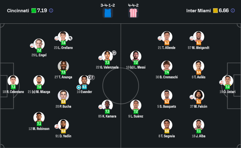 ในมุม วิเคราะห์บอล เกมนี้ซินซินเนติใช้แผน 3-4-1-2 เน้นรับแน่นแล้วโต้กลับเร็ว การครองบอลน้อยกว่าเพียง 44% แต่ใช้โอกาสยิงได้แม่นยำและคมกว่า อินเตอร์ ไมอามีแม้จะครองบอลถึง 56% และเน้นการต่อบอลตามสไตล์แต่จังหวะสุดท้ายไม่เฉียบขาด ขณะที่เกมรับของซินซินเนติใช้เกมรุกกดดันคู่แข่งได้ดีจนแนวรุกของไมอามีทำอะไรไม่ถนัด การจัดวางตำแหน่งและบีบพื้นที่ของเจ้าบ้านจึงทำให้พวกเขาคว้าชัยได้อย่างเด็ดขาด