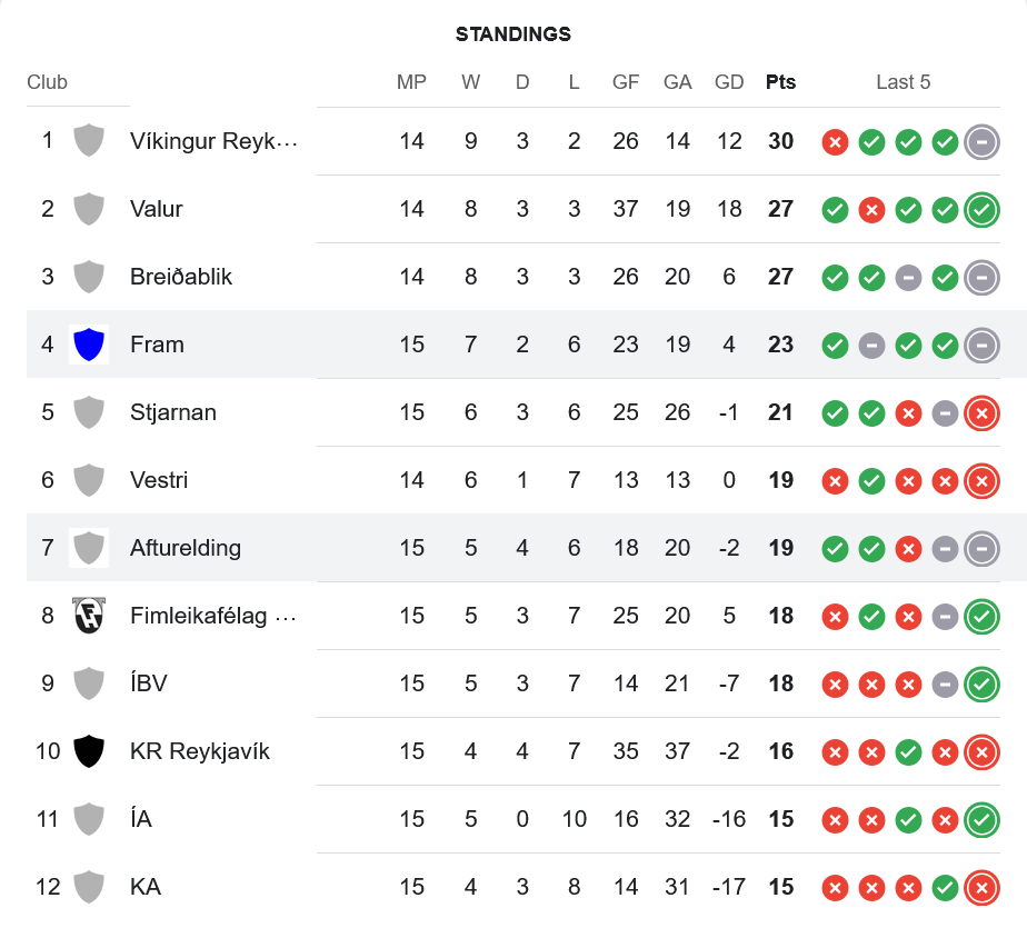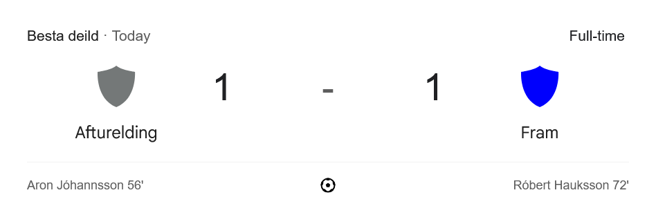 บ้านกีฬาเกาะติด ผลบอลสด ศึกพรีเมียร์ลีกไอซ์แลนด์ คู่ระหว่าง ยูเอ็มเอฟ อัฟตูเลดิ้ง เปิดรังรับการมาเยือนของ เฟรม เรย์จาวิค เกมนี้จบลงด้วยผลเสมอสุดมันส์ 1-1 แบ่งกันไปทีมละแต้ม โดยเจ้าบ้านขึ้นนำก่อนจากลูกยิงของ อารอน โยฮันส์สัน นาที 56 ก่อนที่ เฟรม จะตีเสมอได้จาก โรเบิร์ต เฮาคส์สัน นาที 72
