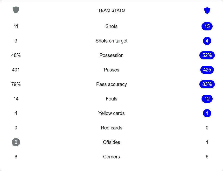 เฟรมครองบอลมากกว่าเล็กน้อยที่ 52% มีโอกาสยิงมากกว่าที่ 15 ครั้ง เข้ากรอบ 4 ครั้ง ส่วนอัฟตูเลดิ้งยิง 11 ครั้ง เข้ากรอบ 3 ครั้ง การจ่ายบอลและความแม่นยำของเฟรมเหนือกว่าที่ 83% ส่วนอัฟตูเลดิ้งอยู่ที่ 79% ฟาล์วใกล้เคียงกัน แต่เจ้าถิ่นโดนใบเหลืองมากถึง 4 ใบ