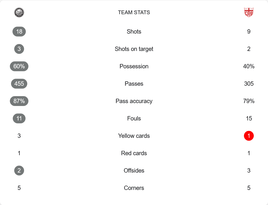 โอเปราริโอเป็นฝ่ายครองบอลถึง 60% จ่ายบอลแม่นยำ 87% ยิงรวม 18 ครั้ง เข้ากรอบ 3 ส่วนซีอาร์บี ครองบอลเพียง 40% แต่ยิงได้ 9 ครั้ง เข้ากรอบ 2 ทั้งสองทีมโดนเหลืองรวมกัน 4 ใบ และแดงทีมละหนึ่งใบ