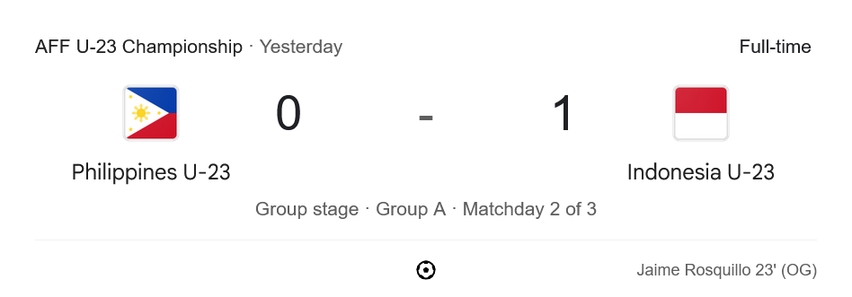 เกมนัดสองของกลุ่ม A ในศึก AFC U23 Championship เมื่อค่ำวานนี้จบลงด้วยผล บ้านผลบอล อินโดนีเซีย U23 บุกมาเก็บสามแต้มเต็มจากฟิลิปปินส์ U23 ได้อย่างหวุดหวิด 1-0 จากประตูที่เกิดขึ้นแบบโชคร้ายของไจเม่ โรสกิลโญ่ ในช่วงนาที 23 ที่สกัดพลาดเข้าประตูตัวเอง แม้อินโดนีเซียจะครองเกมบุกได้เหนือกว่าแทบทั้งเกมแต่ก็เจาะเพิ่มไม่ได้ สุดท้ายก็เพียงพอสำหรับชัยชนะ