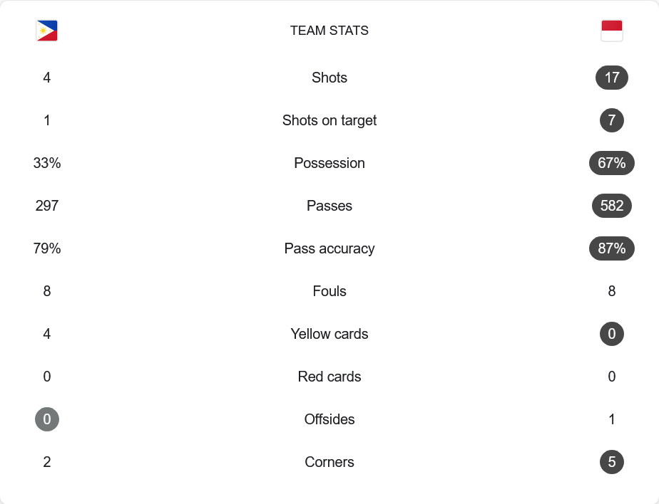 เกมนี้อินโดนีเซียเหนือกว่าชัดเจนทั้งการครองบอลที่มากถึง 67% กับจำนวนการผ่านบอลกว่า 580 ครั้ง ขณะที่ฟิลิปปินส์ครองได้เพียง 33% และผ่านบอลไม่ถึง 300 ครั้ง อินโดนีเซียสร้างโอกาสยิงถึง 17 ครั้ง เข้ากรอบ 7 ขณะที่ฟิลิปปินส์ยิงแค่ 4 ครั้งและตรงกรอบเพียงหนเดียว สถิติอื่นๆ ค่อนข้างสูสีกันในเรื่องฟาวล์และคอร์เนอร์