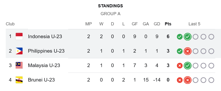 ชัยชนะนัดนี้ทำให้อินโดนีเซีย U23 รั้งจ่าฝูงกลุ่ม A มี 6 แต้มเต็มจาก 2 นัด ทิ้งฟิลิปปินส์และมาเลเซียที่ตามมาด้วย 3 แต้มเท่ากัน แต่ฟิลิปปินส์ยังคงมีลุ้นเข้ารอบในเกมสุดท้ายหากเก็บชัยได้