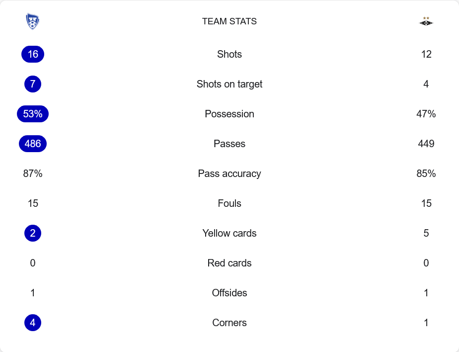 ชาร์ปบอร์กครองบอลมากกว่าเล็กน้อยที่ 53% ผ่านบอลแม่นกว่า 87% และสร้างโอกาสยิงได้ถึง 16 ครั้ง เข้ากรอบ 7 ส่วนโรเซนบอร์กแม้ครองบอลน้อยกว่าแต่ยิงได้ 12 ครั้งและเฉียบคมกว่าในครึ่งแรก ทั้งสองทีมมีเกมที่รุนแรงพอสมควรโดยฟาวล์เท่ากัน 15 ครั้ง แต่โรเซนบอร์กโดนใบเหลืองมากถึง 5 ใบ