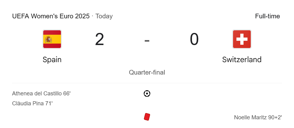 ชัยชนะนัดนี้ส่งสเปนเข้าสู่รอบรองชนะเลิศยูโรหญิง 2025 เรียบร้อย ส่วนสวิตเซอร์แลนด์หยุดเส้นทางไว้เพียงรอบ 8 ทีมสุดท้าย