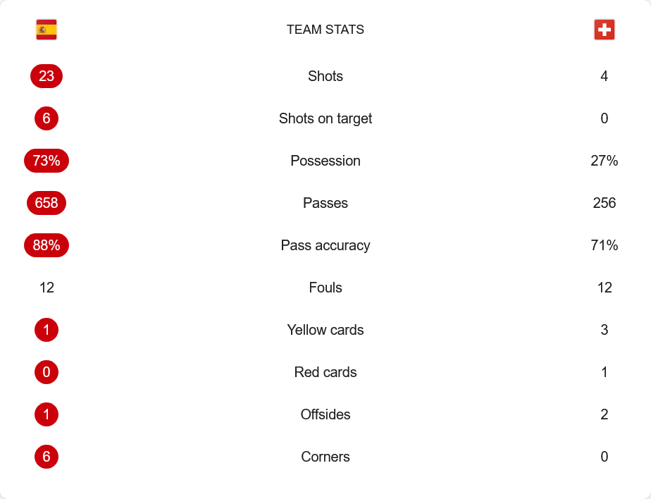 สเปนสร้างโอกาสยิงได้ถึง 23 ครั้ง เข้ากรอบ 6 ครั้ง ครองบอลสูงถึง 73% จ่ายบอล 658 ครั้งด้วยความแม่นยำถึง 88% ในขณะที่สวิตเซอร์แลนด์ครองบอลเพียง 27% ยิงไม่ตรงกรอบเลยทั้ง 4 ครั้ง แสดงให้เห็นความเหนือชั้นของสเปนตลอดทั้งเกม