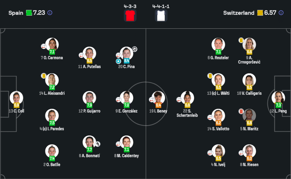 สเปนจัดระบบ 4-3-3 เล่นเกมรุกแบบเพรสซิ่งสูงเน้นต่อบอลสั้นเข้าทำตรงกลาง สลับโยนเข้าข้าง สร้างโอกาสได้อย่างต่อเนื่อง การครองบอลเหนือกว่าและจังหวะขึ้นเกมเร็วจัดจ้าน ในขณะที่สวิตเซอร์แลนด์เน้นเกมรับรอสวนกลับด้วย 4-4-1-1 แต่ก็โดนสเปนกดดันจนเกมสวนไม่เป็นรูปเป็นร่าง เห็นชัดว่าแผนรุกของสเปนประสานงานกันดีกว่า สมกับการวิเคราะห์บอลก่อนเกมที่ชี้ว่าพวกเธอได้เปรียบทุกมิติ