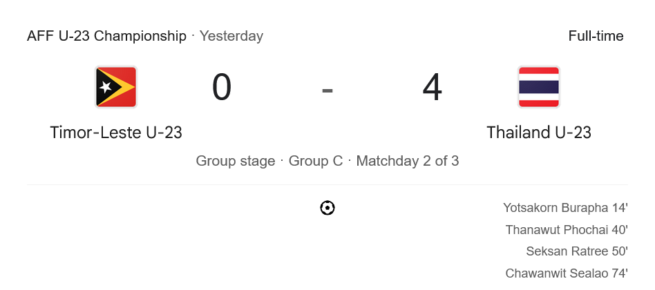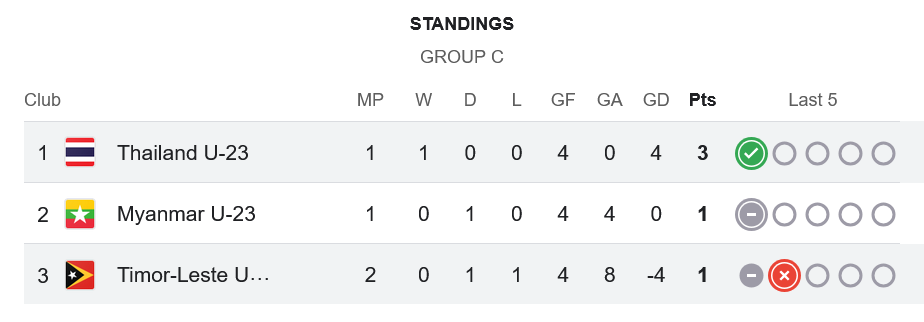 ไทย ยู-23 ขยับขึ้นนำหัวตารางกลุ่ม C มี 3 คะแนนเต็มจากนัดแรก ประตูได้เสียบวกถึง 4 ลูก ทิ้งห่างเมียนมาร์และติมอร์-เลสเต ที่เสมอกันไปในเกมก่อนหน้า ทำให้โอกาสเข้ารอบต่อไปสดใสสุดๆ