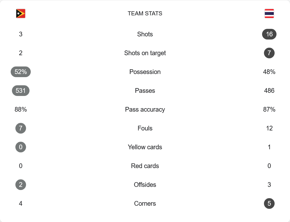 แม้ติมอร์-เลสเตจะครองบอลมากกว่าที่ 52% และจ่ายบอลมากกว่า 531 ครั้ง แต่ไทยสร้างโอกาสมากถึง 16 ครั้ง เข้ากรอบ 7 ครั้ง และจบสกอร์ได้ถึง 4 ลูก ความแม่นยำของไทยสูงกว่าทั้งจังหวะยิงและการเข้าทำ โดยติมอร์-เลสเตยิงเพียง 3 ครั้งเท่านั้นตลอดเกม แม้จะมีใบเหลืองฝั่งไทย 1 ใบ แต่โดยรวมถือว่าคุมสถานการณ์ได้ดี