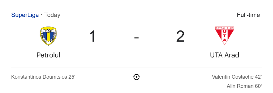 การแข่งขันฟุตบอล โรมาเนีย ลีกา 1 ประจำวันนี้จบลงด้วยเกมสุดเข้มข้นที่แฟนบอลติดตาม ผลบอลสด กันอย่างไม่ละสายตา เมื่อ ปิโตรลูล โปรเอสติ เปิดบ้านพ่ายให้กับ ยูทีเอ อารัด ไปอย่างสุดมัน 1-2 ในเกมที่เต็มไปด้วยความดุเดือด การเข้าปะทะหนัก และการใช้โอกาสอย่างมีประสิทธิภาพของทีมเยือน