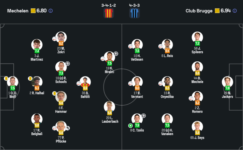 - กองกลาง: ฮันส์ วานาเก้น (7.5), ราฟาเอล ออนเยดิก้า (6.5), โรบิน เวอร์มานต์ (6.0)