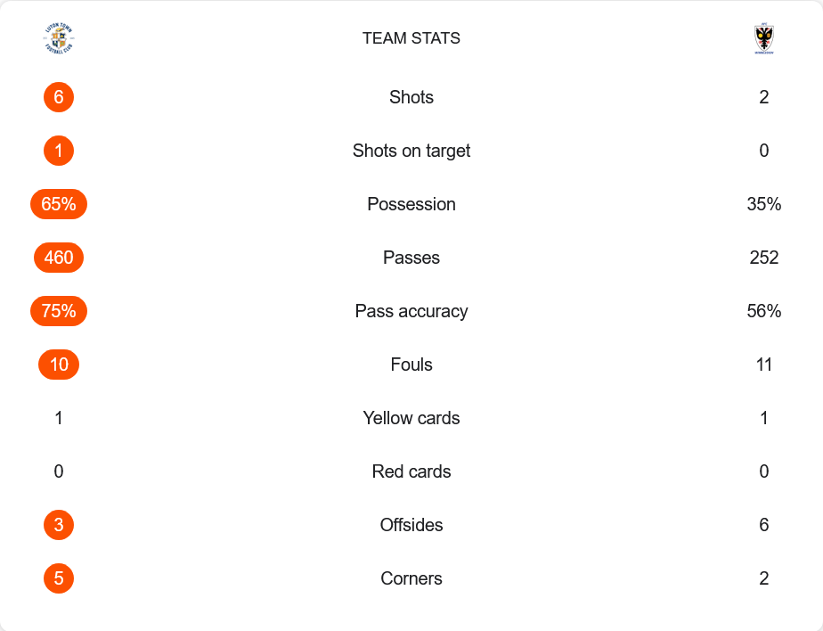 เกมนี้ ลูตัน ทาวน์ทำสถิติครองบอลเหนือกว่าถึง 65% เทียบกับ 35% ของวิมเบิลดัน และมีจำนวนการผ่านบอลสูงถึง 460 ครั้ง ขณะที่คู่แข่งผ่านเพียง 252 ครั้ง อัตราการจ่ายบอลแม่นยำของเจ้าบ้านอยู่ที่ 75% ส่วนทีมเยือนมีเพียง 56% เท่านั้น แม้จะมีโอกาสยิงมากกว่าเพียงเล็กน้อย (6 ต่อ 2) แต่สิ่งที่ชัดเจนที่สุดคือวิมเบิลดันไม่มีโอกาสยิงเข้ากรอบเลยตลอดเกม ขณะที่ลูตันมีเพียงหนึ่งครั้ง — และเป็นประตูจากการทำเข้าประตูตัวเองของฝ่ายตรงข้าม ส่วนสถิติฟาวล์และใบเหลืองก็สูสีกัน โดยเจ้าถิ่นโดนไป 10 ฟาวล์ ส่วนทีมเยือน 11 ฟาวล์ ทั้งสองทีมมีใบเหลืองฝั่งละ 1 ใบ