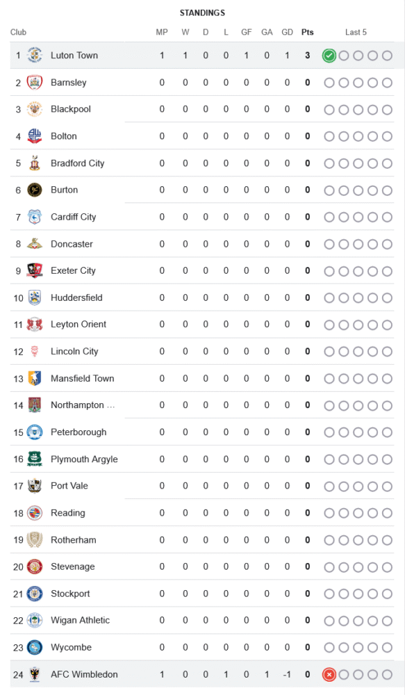 ชัยชนะนัดนี้ทำให้ ลูตัน ทาวน์ เปิดฤดูกาลด้วยการเก็บ 3 แต้มเต็มขึ้นนำเป็นจ่าฝูงชั่วคราว โดยเป็นเพียงทีมเดียวที่ลงแข่งและมีแต้มในตอนนี้ ขณะที่ทางฝั่ง วิมเบิลดัน หล่นไปรั้งอันดับสุดท้ายทันที ด้วยการมี 0 คะแนน และผลต่างประตู -1 จากการทำเข้าประตูตัวเอง