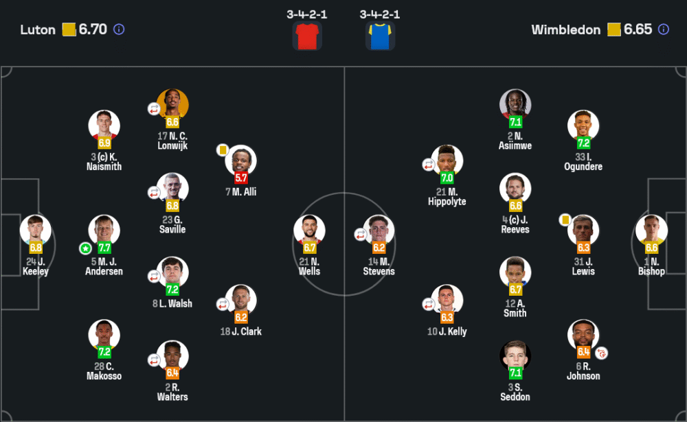 ฝั่งวิมเบิลดัน ใช้แผนเดียวกันคือ 3-4-2-1 แต่เน้นตั้งรับลึกมากกว่า มีการครองบอลเพียง 35% และจ่ายบอลน้อยกว่าครึ่งของลูตัน การต่อบอลและคอนโทรลแดนกลางทำได้ไม่ดีนัก (วิเคราะห์บอล ชัดเจนว่าเกมนี้พวกเขาหวังแบ่งแต้มมากกว่าบุกชนะ) และท้ายที่สุดความผิดพลาดเพียงครั้งเดียวก็ทำให้ต้องเสียประตูและแต้มไปแบบน่าเสียดาย