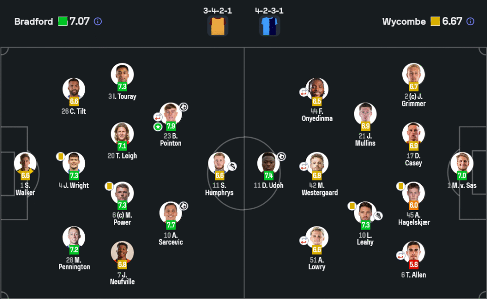 จากการ วิเคราะห์บอล เชิงลึก เกมนี้ชัดเจนว่าแบรดฟอร์ดวางแผนเน้นเกมเร็ว ใช้การเข้าทำเพียงไม่กี่จังหวะแต่ได้ผลลัพธ์สูง เกมรับยืนลึกแต่ไม่เสียสมาธิ การครองบอลเพียง 31% แต่กลับเปลี่ยนโอกาส 12 ครั้งเป็น 2 ประตู ถือว่าใช้โอกาสอย่างคุ้มค่า ขณะที่วีคอมบ์เน้นครองบอล บุกจากปีกทั้งสองฝั่งแต่ขาดความเฉียบคมในจังหวะสุดท้าย ครองบอลมากถึง 69% แต่ยิงตรงกรอบเพียง 3 ครั้ง สะท้อนชัดว่าเกมรุกยังต้องปรับจูน จังหวะต่อบอลแม่นก็จริง แต่จบสกอร์ยังไม่เฉียบเท่าเจ้าถิ่น