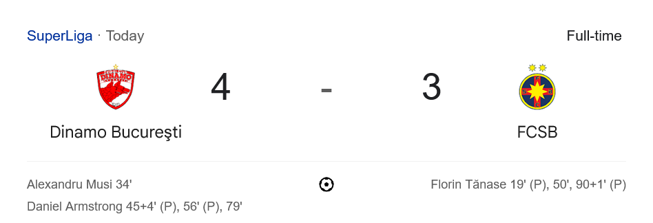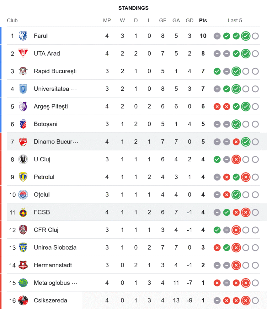 ดินาโม บูคาเรสต์ เก็บเพิ่มเป็น 5 คะแนนจาก 4 นัด ขยับขึ้นมาอยู่อันดับ 7 ของตาราง ห่างจากกลุ่มบนไม่มาก ขณะที่สเตอัว บูคาเรสต์ มี 4 คะแนนจาก 4 นัด หล่นไปอยู่อันดับ 11 ฟอร์มสะดุดต่อเนื่อง แม้ยังมีเวลาให้แก้ตัว แต่ความกดดันเริ่มเข้ามาทุกเกมที่เล่น