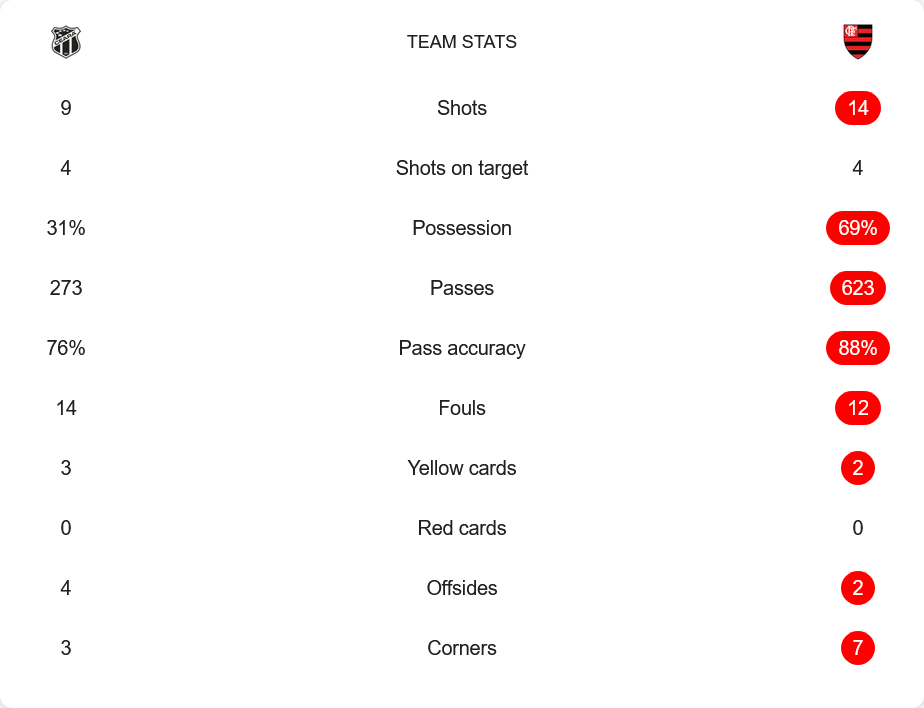 สถิติแสดงให้เห็นความแตกต่างอย่างชัดเจน ฟลาเมงโกครองบอลสูงถึง 69% จ่ายบอลถึง 623 ครั้ง เทียบกับซิเอร่าแค่ 273 ครั้ง การจ่ายบอลของทีมเยือนแม่นยำถึง 88% ขณะที่เจ้าถิ่นอยู่ที่ 76% แม้จะบุกเยอะกว่ายิงมากกว่า แต่ทั้งสองทีมยิงตรงกรอบเท่ากันที่ 4 ครั้ง ฟาล์วใกล้เคียงกัน (14 ต่อ 12) ซิเอร่าได้ใบเหลือง 3 ใบ ส่วนฟลาเมงโกโดนไป 2 ใบ และลูกเตะมุม ฟลาเมงโกได้ 7 ครั้ง ส่วนซิเอร่าเพียง 3 ครั้ง