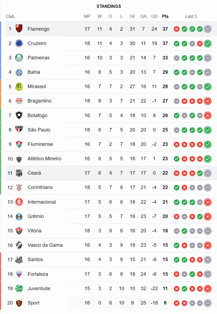 แม้จะเก็บได้เพียง 1 แต้มแต่ ฟลาเมงโกยังคงครองจ่าฝูง ของตารางร่วมกับ ครูเซโร่ ที่มี 37 แต้มเท่ากัน แต่แข่งน้อยกว่า 1 นัด ขณะที่ ซิเอร่า อยู่อันดับ 11 มี 22 แต้มจาก 17 นัด ยังพอมีลุ้นพื้นที่โคปา ซูดาเมริกานา หากรักษาฟอร์มได้ต่อเนื่อง