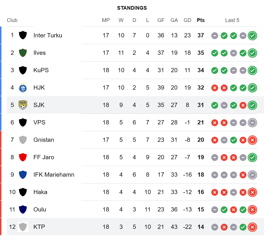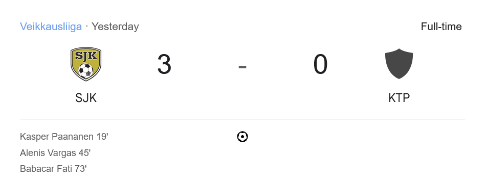จากชัยชนะนัดนี้ SJK เก็บเพิ่มเป็น 31 คะแนน จาก 18 นัด ขยับขึ้นมารั้งอันดับ 5 ของตาราง ไวเคาส์ลีกา ไล่บี้กลุ่มหัวตารางอย่างเข้มข้น ด้าน KTP ค็อตก้า แพ้แบบหมดรูป ยังจมอยู่บ๊วยของตารางที่ 14 แต้ม จาก 18 นัด และต้องเร่งฟอร์มด่วนหากไม่อยากจมท้ายแบบยาว ๆ