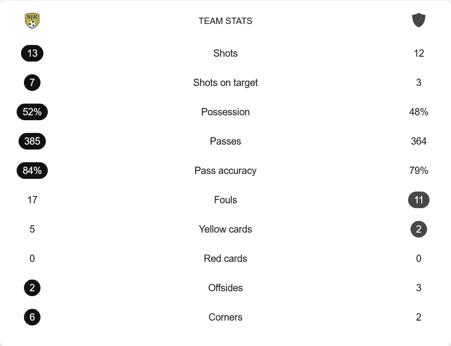 จากข้อมูล บ้านผลบอล ในเกมนี้ SJK มีสัดส่วนการครองบอล 52% เทียบกับ KTP ที่ทำได้ 48% แต่สิ่งที่แตกต่างชัดเจนคือการจ่ายบอล SJK มีความแม่นยำสูงถึง 84% ขณะที่ KTP ทำได้เพียง 79% โอกาสยิงของ SJK อยู่ที่ 13 ครั้ง โดยตรงกรอบ 7 ครั้ง ส่วน KTP ได้ยิง 12 ครั้ง เข้ากรอบเพียง 3 ครั้ง นอกจากนี้ยังมีจังหวะฟาวล์จากฝั่ง KTP มากถึง 17 ครั้ง และโดนใบเหลืองไปถึง 5 ใบ เทียบกับ SJK ที่โดนเพียง 3 ใบเท่านั้น สะท้อนถึงความตึงเครียดในเกมและความผิดพลาดในการไล่ตัดเกมเจ้าบ้าน